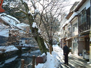 | 温泉街の中心を流れる大谿川(おおたにがわ)と柳並木、軒を連ねる宿・・・・ ゆっくり歩いているだけで、温泉情緒が味わえます |