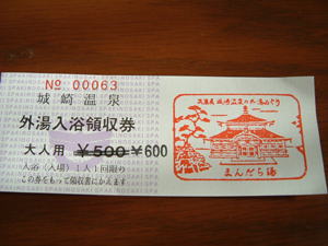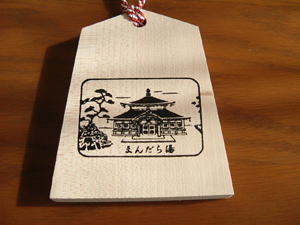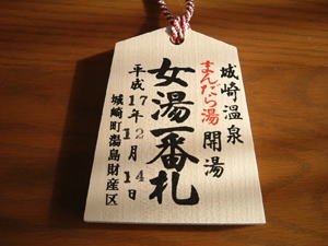 | 今回は、ツァーでの外湯めぐりで時間が無かったのですがまんだら湯に入ることにしました。 時間は、3時きっかりにしか入浴出来無いという事で、玄関先で待つことにしました。 その訳は、3時にまんだら湯に来た、一番の男の人と女の人には一番札がいただけるという事が 表に書いてあったのです。 2時59分に扉が開いて、女湯一番札をいただきました。ラッキー 記念の品で〜す! |
