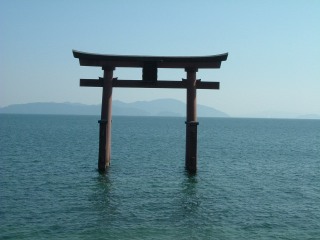 湖中に宮島の厳島神社を思わせる 朱塗りの鳥居がたっている 何度見てもまか不思議な風景です 湖中の鳥居はもともと陸地にあったものが、 1662年に高島郡を中心に起きた 大地震(琵琶湖西岸地震M7.6)によって 水中に陥没したものである 前の道路は、往来が激しいので 写真撮影には特に注意が必要です |
