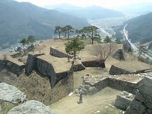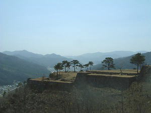 | 町観光案内センターで台風により以前のハイキングコースが上れないと言われ 竹田小学校のグランド横からハイキングを始める このハイキングコースは、急勾配で長い長い巾の狭い階段でした 私達は、約50分かかって竹田譲跡にたどり着きました。 城跡の眺めは素晴らしく、急な階段を登ってきて良かったと思いました (しかし車も人も登れないと言う所から大勢の人が登ってきていました) |